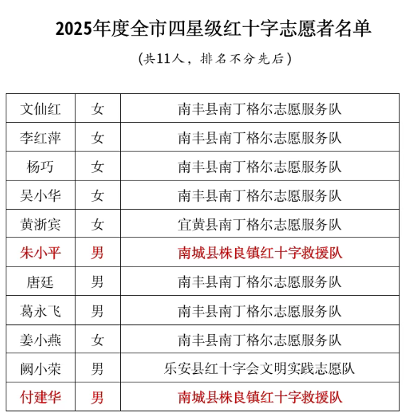 江西企业网讯 热烈祝贺!在2025年全省红十字志愿者星级认定工作中,南城县红十字救援队杨萍、尧小文两名志愿者凭借无私奉献的精神和突出的志愿服务表现,成功获评全省五星级红十字志愿者!此外,县红十字救援队朱小平、付建华两位志愿者也在市红十字会的星级评定中脱颖而出,荣获四星级红十字志愿者称号!