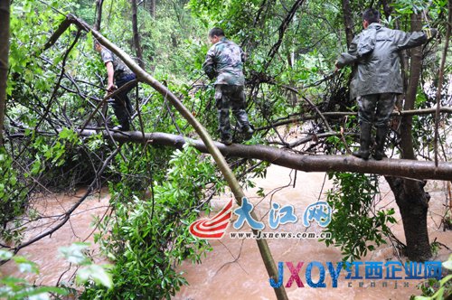 桥梁被冲毁,搜救队员搭起独木桥赶赴事发现场。