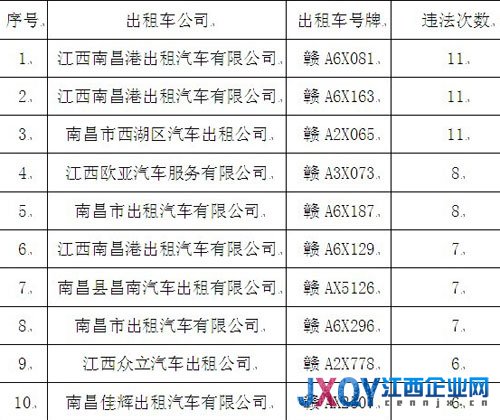 大江网讯戴伟、记者欧阳远媛报道:16日,根据《南昌市客运车辆交通违法行为处理办法》的要求,南昌交管局对今年4月出租车违法率排名最高的出租车企业、发生5起以上违法行为的出租车排名情况以及发生3起以上违法行为的公交车进行通报。