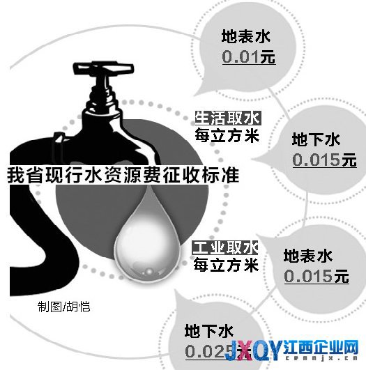 据介绍,我省调整水资源费征收标准征收范围及对象为:在本省行政区域内,凡利用取水工程或者设施直接从江河、湖泊或者地下取用水资源的单位和个人,除《江西省水资源条例》规定的免征情形及已缴纳地热水、矿泉水的采矿权使用费和矿产资源补偿费的,都应当缴纳水资源费。但农业生产用水(种植业、畜牧业、水产养殖业、林业)暂缓征收水资源费。根据我省经济发展的实际情况和各方的承受力,我省水资源费调整将分“三步走”:今年9月1日至明年9月1日,工商业取水和城镇公共供水水资源费征收标准由现有标准(见图)调整至0.06元/立方米、0.04元/立方米,地下水调整至0.1元/立方米;明年9月1日至2015年9月1日,每立方米地表水由0.05元调整到0.075元,地下水由0.1元调整到0.15元;2015年9月1日达到国家规定的最低标准(地表水0.10元/立方米、地下水0.20元/立方米)。