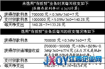 以某客户住房按揭贷款余额100万元为例,贷款利率享受2008年12月23日后的8.5折为5.05%,同时拥有活期存款70万元。选用“存抵贷”可节省一半的贷款利息支出,如果存款更多,最高可节省80%的贷款利息。详见下表: