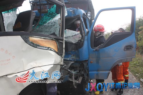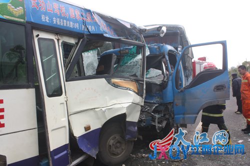 据现场的交警介绍,当时货车由东向西往洋溪镇方向行驶,公交车由洋溪开往安福县城。由于早上起了雾,视线不是很好,货车司机在超车后躲闪不及,与对面驶来的公交车撞在了一起。