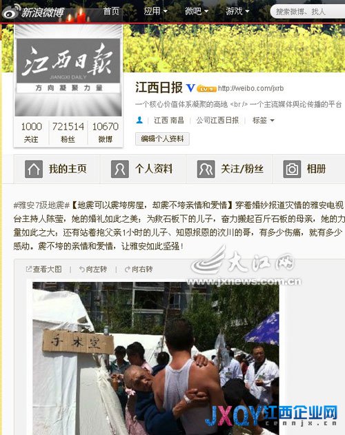 江西日报微博呼唤爱心。当天,江西日报微博联合江西省红十字会,呼吁向灾区人民捐款献爱心。呼吁让我们行动起来,心系一起!第一时间即有“粉丝”求账号献爱心。同时,江报微博还号召大家行动起来,走上街头献血,随时支援灾区。